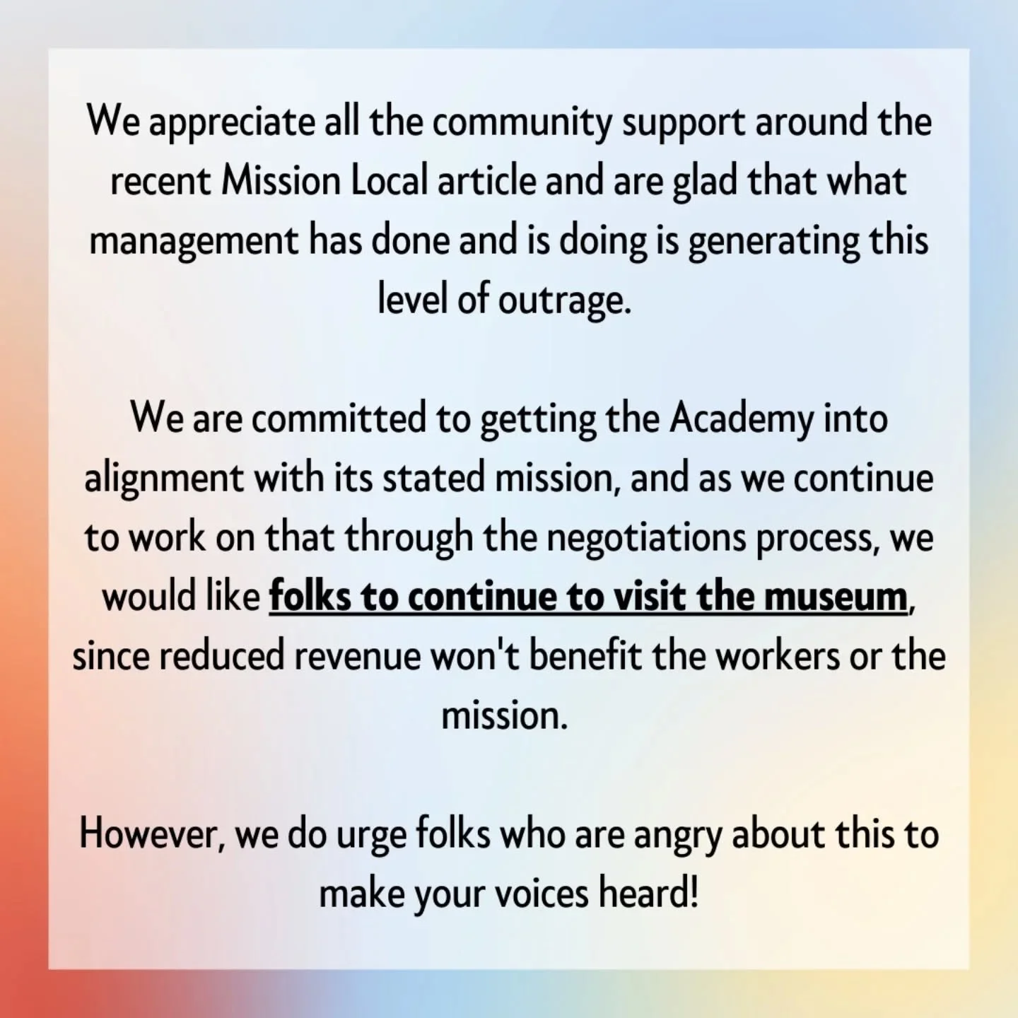 In recent years, employees at over twenty museums have unionized to collectively bargain for livable wages and improved working conditions. They join with many cultural institutions that have been unionized for decades. Here in the Bay Area, thousands of workers at over fifty nonprofit organizationsβincluding the de Young, Legion of Honor, Asian Art Museum, and the Exploratoriumβare unionized as members of SEIU 1021 and have successfully won contracts with better pay, benefits, job security, and working conditions. This is the union differenceβtogether, we can do the same.